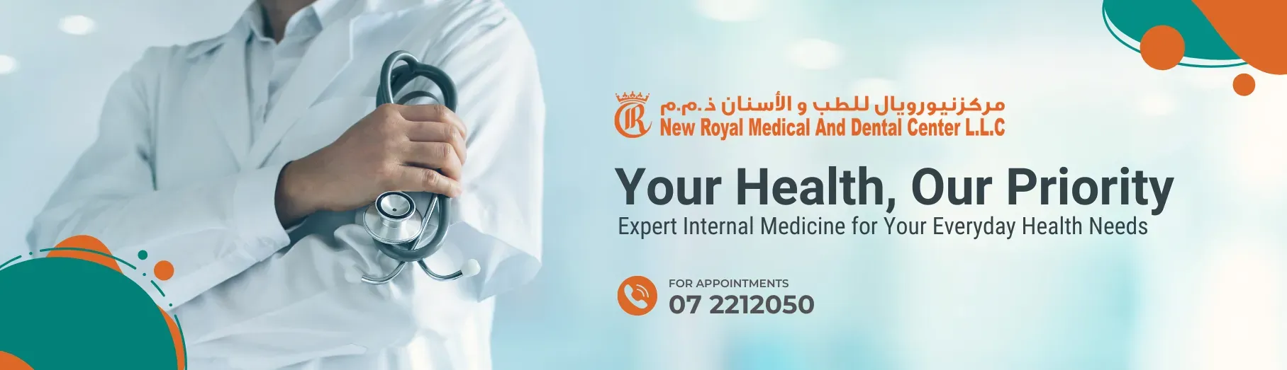 At New Royal Medical and Dental Center, Ras Al Khaimah, our Internal Medicine department provides expert care for adults dealing with chronic conditions like diabetes, hypertension, and heart disease. With a focus on early diagnosis, preventive care, and personalized treatment, our experienced doctors are here to support your long-term health in a trusted, patient-friendly environment.